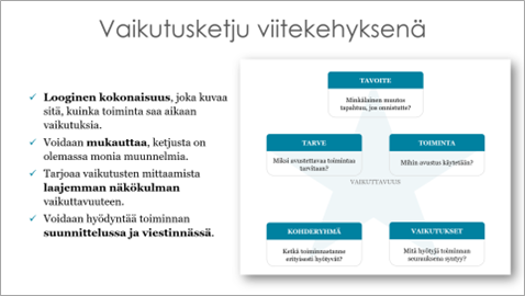 Vaikutusketju on käyttökelpoinen tapa edetä vaikuttavuustyössä, sillä se ohjaa kertomaan minkälaisia muutoksia tavoitellaan, miksi niitä tarvitaan ja miten ne tuotetaan. Alla olevassa kuvassa on perusteltu, miksi vaikutusketju valittiin lähtökohdaksi myös Helsingin uudistuksessa. Vaikka vaikutusketju nimensä mukaisesti visualisoidaan useimmiten ketjuksi tai vuokaavioksi, tällä kertaa mielekkäältä tuntui valita sen muodoksi tähti (ks. kuva alla). Lue lisää vaikuttavuuden mallintamisesta tästä kirjoituksesta.
