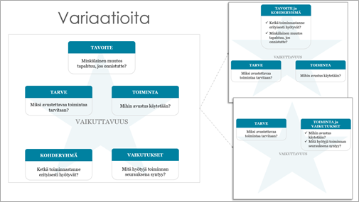 Vaikutusketjun joustavuus auttaa näiden periaatteiden toteuttamisessa. Vaikka vaikutusketju muodostaa kokonaisuuden, sen osat tarjoavat kukin oman näkökulmansa toiminnan vaikuttavuuteen. Jo yhden tai kahden ketjun osan huomioiminen ja syventäminen voi vahvistaa toiminnan vaikuttavuutta jonkin verran – ilman että uudet vaatimukset tiputtavat osan porukasta kelkasta. Juuri tämän ajatuksen haluamme välittää tähti-metaforalla: Vaikutusketjua ei ole pakko sisällyttää uusiin lomakkeisiin kokonaisuudessaan, vaan luotaessa avustuslomakkeita osioita voi valikoida ja / tai yhdistää eri tavoin (ks. kuva alla). Vaatimuksia on mahdollista myös räätälöidä esimerkiksi haettavan avustussumman ja avustettavan toiminnan luonteen mukaan.